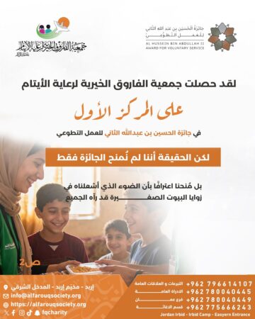 11 ديسمبر، 2025 حصول جمعية الفاروق الخيرية لرعاية الأيتام على الأخبار لا يوجد تعليق 143 الآراء بكل فخر، حصلت جمعية الفاروق الخيرية لرعاية الأيتام على المركز الاول في جائزة الحسين بن عبدالله الثاني للعمل التطوعي لعام 2025. هذا الإنجاز هو ثمرة 35 عامًا من العمل الإنساني، وشهادة على أثرٍ